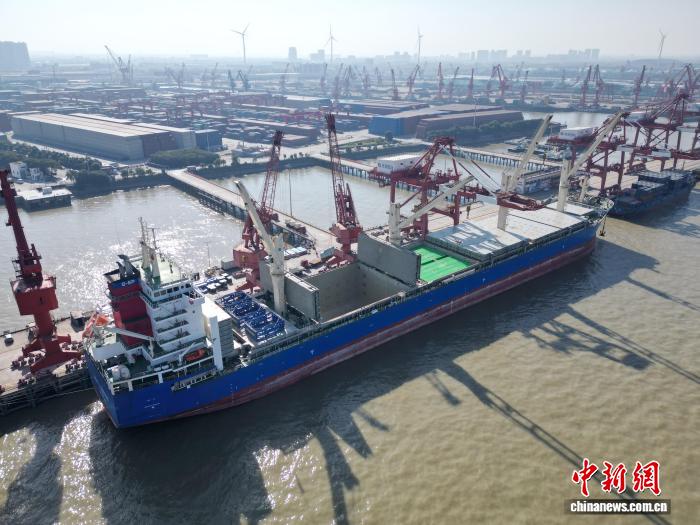 11月28日,江苏江阴港开港以来的最大杂货船“鼎韩”轮完成装货,驶往挪威。江阴海事局 供图