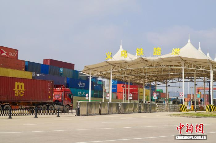 3月6日,一列满载出口货物的集装箱卡车驶入义乌铁路港。董易鑫 摄