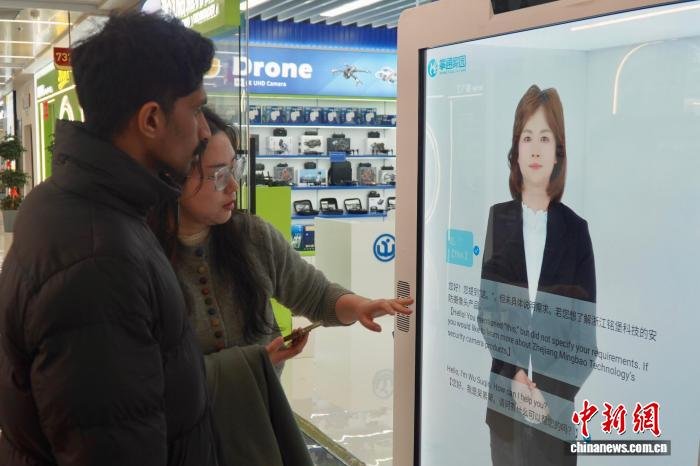 2月28日,浙江义乌,中外客商在店铺门前与多语种数字人对话,了解市场及产品。董易鑫 摄