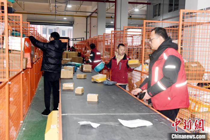 工作人员分拣快递,每件快递背后传递着亲情与思念。(湖北省交通运输厅供图)