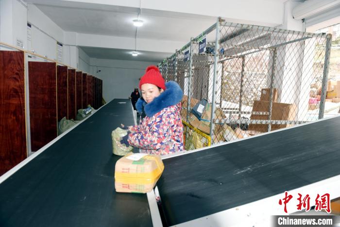 湖北建始官店镇寄递物流综合服务站工作人员正在分拣快递。(湖北省交通运输厅供图)