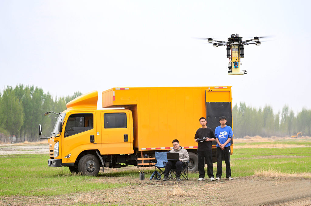 4月9日,农业植保无人机编队在保定市清苑区进行麦田飞防作业。