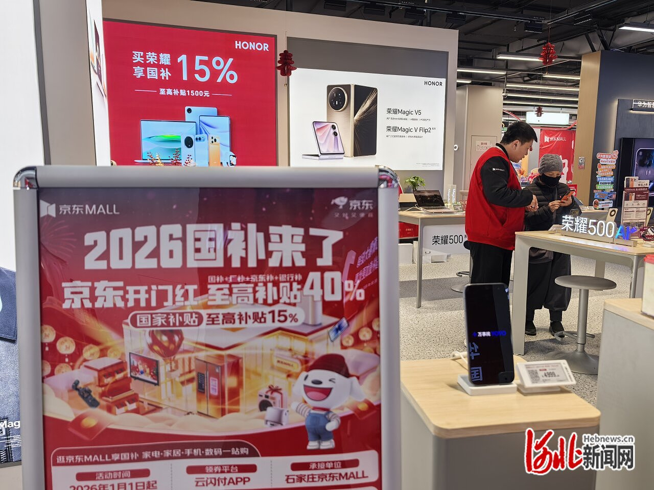 1月14日15时,走进京东mall石家庄新华店,“2026国补来了”的宣传语随处可见,消费品以旧换新的营销氛围拉满。