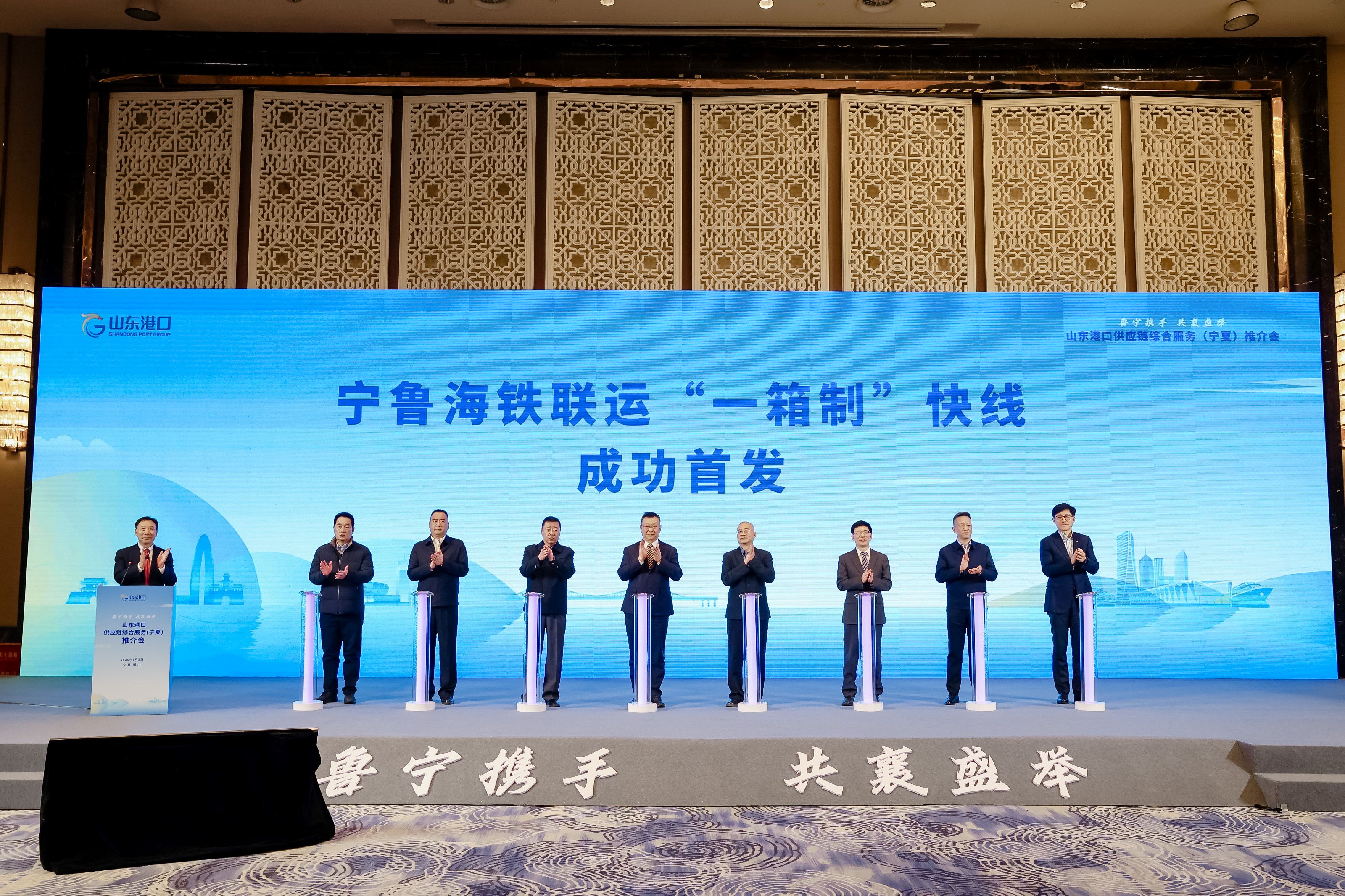 宁夏回族自治区商务厅党组成员、副厅长朱东,宁夏回族自治区交通运输厅二级巡视员陈钧,银川海关党委委员、副关长龙军,银川市综合保税区管理委员会副主任高剑,青岛海关党委委员、副关长、一级总监石勇,青岛市委宣传部副部长、市文明办主任张升强,山东港口党委副书记、董事、总经理李奉利,宁夏金昱元化工集团股份有限公司总裁乔冠荣等出席活动。朱东、龙军、石勇、乔冠荣致辞,李奉利介绍山东港口发展情况并推介供应链综合服务体系。山东港口党委常委、常务副总经理马德亮主持活动。与会领导共同见证宁鲁海铁联运“一箱制”快线启动。