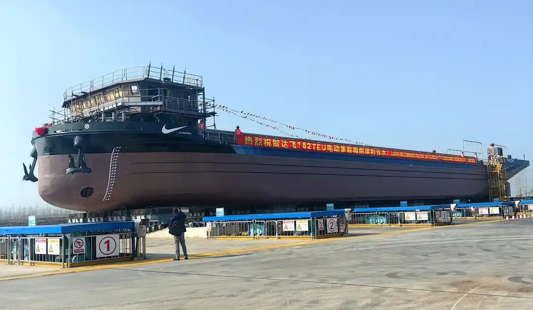 这是中国制造纯电动力内河集装箱运输船首次出海叩开国际船舶制造市场的大门。