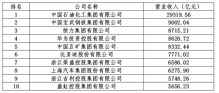榜单前三名企业分别为中国石油化工集团、中国宝武钢铁集团和恒力集团。