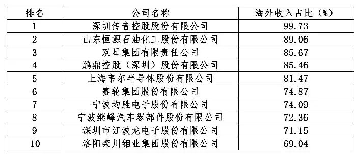 表3.“2025中国制造业企业500强”海外收入占比前10位