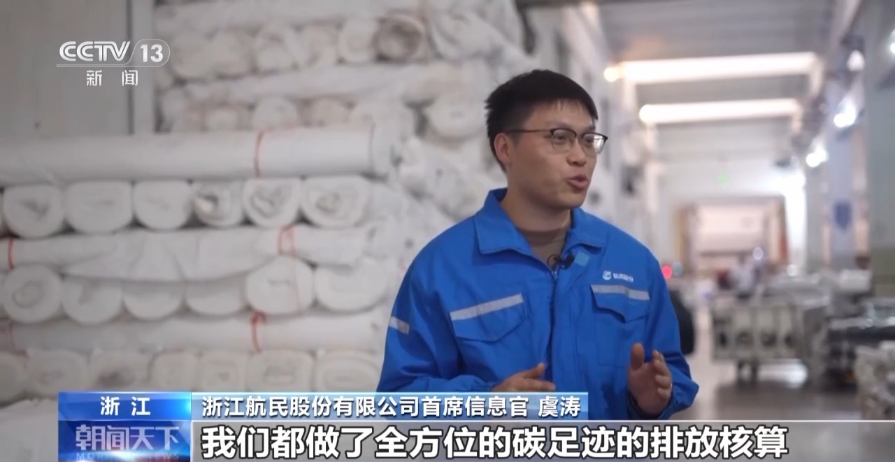 浙江航民股份有限公司首席信息官 虞涛:现在,海外客户都要求我们做碳足迹的认证。现在生产的每一平方米布料,从原料到生产流程,我们都做了全方位的碳足迹排放核算。