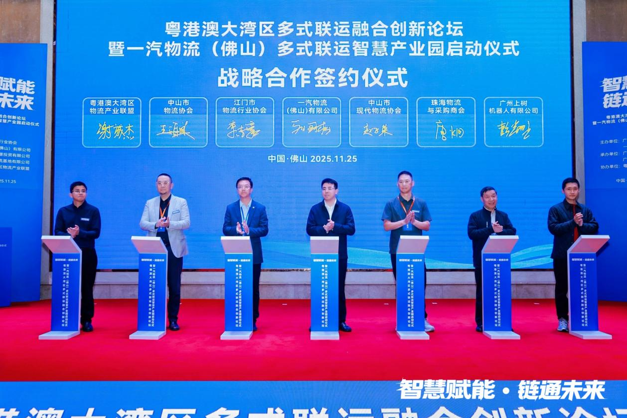 启动仪式后举行了战略合作签约仪式,一汽物流(佛山)多式联运智慧产业园与多家合作单位签署战略协议,携手开启合作新篇章。各方将依托资源互补与协同合作,共同推动多式联运融合发展。
