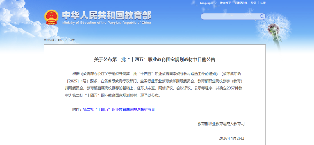 导读:2026年1月26日,教育部职业教育与成人教育司公布了关于第二批“十四五”职业教育国家规划教材书目的公告。