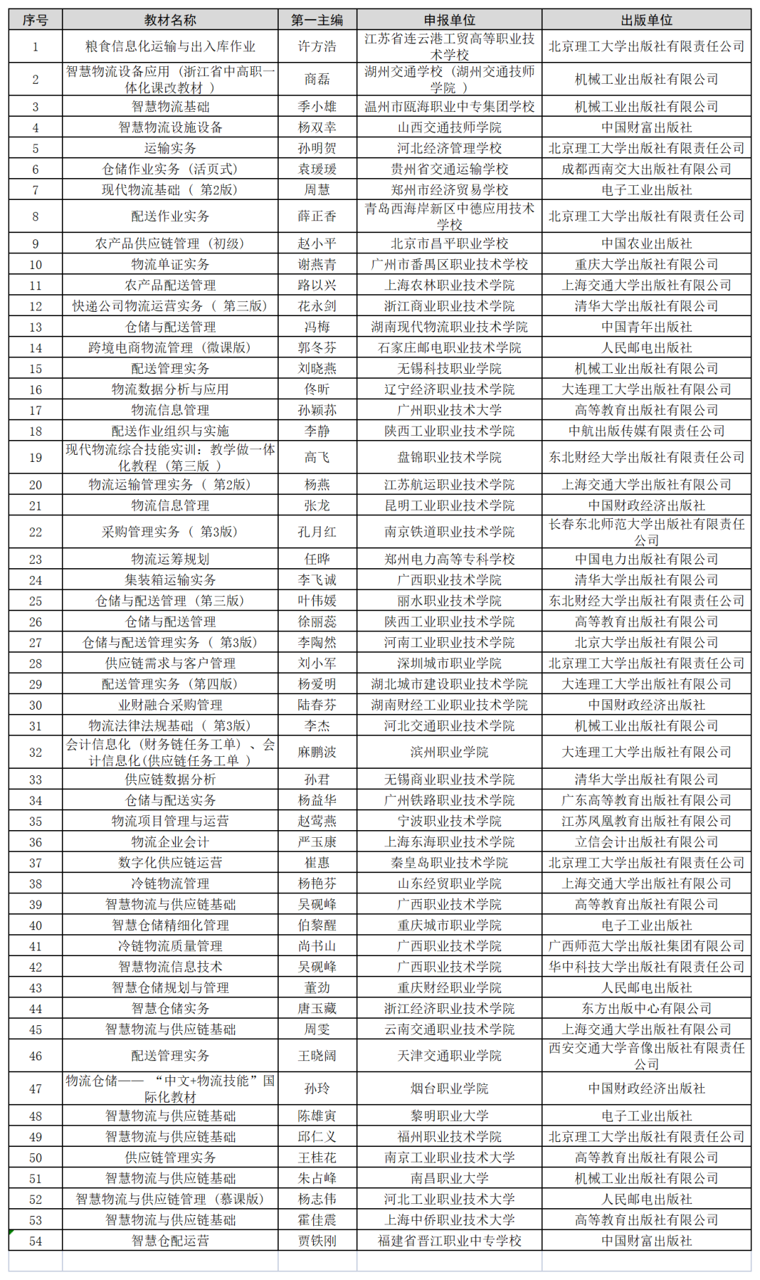 本次公布的名单里共有54本物流类教材入选第二批“十四五”职业教育国家规划教材书目名单,具体名单如下: