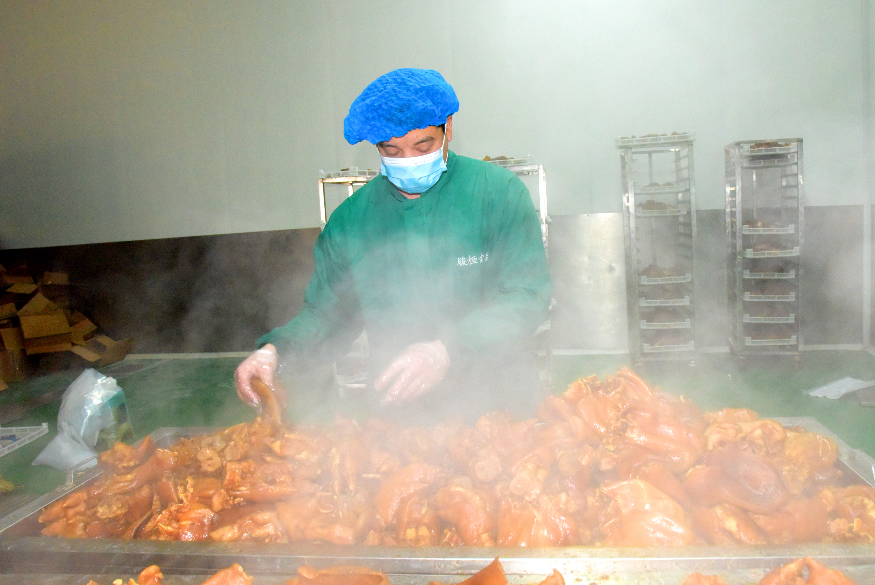 2月2日,安徽省马鞍山市骏桓食品有限公司员工在蒸煮卤制猪副产品,将一盒盒“三只小猪卤百味”酱卤五香猪头、五香猪耳、五香肥肠、五香猪肚、五香猪蹄等即食产品发往各地,积极保供春节市场需求。该公司深耕肉食行业市场多年,组建专业食品研发团队,投资建成现代化熟食加工生产线,实现从原料供应商向终端食品制造商的跨越式转型,从冷链、原料分级、渠道整合,逐步构建起华东地区猪副产品的供应网络,成为多家食品企业、餐饮的核心供应商。