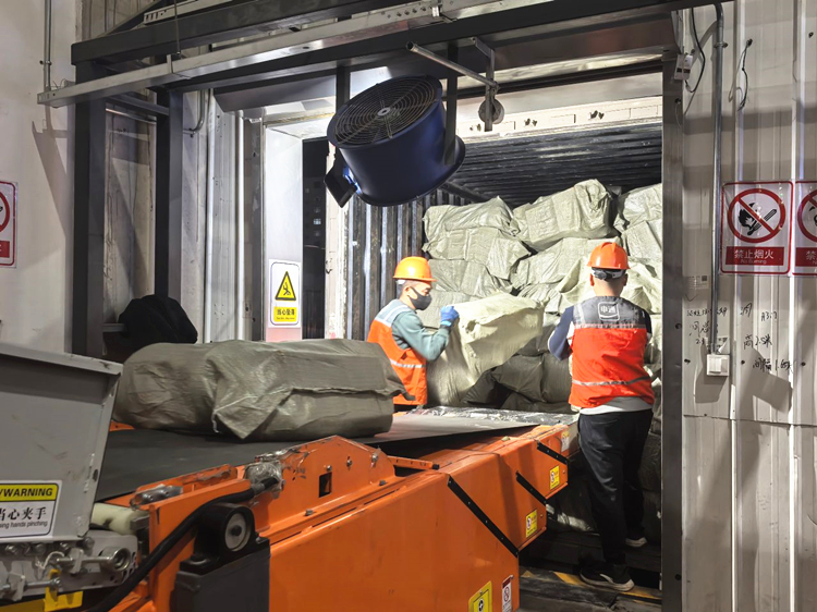 图为在申通快递华北转运中心内,包裹到港后工作人员借助卸货设备进行卸货,把包裹移入传送带。万倩摄