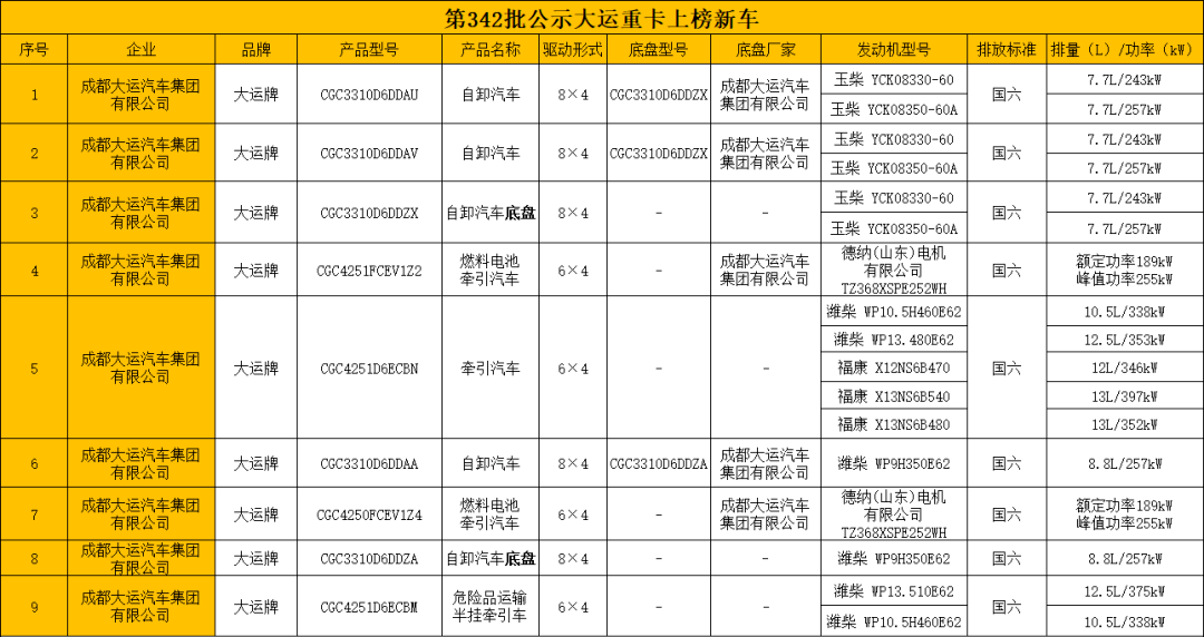 9款大运重卡新车(含底盘)上榜 自卸占比过半