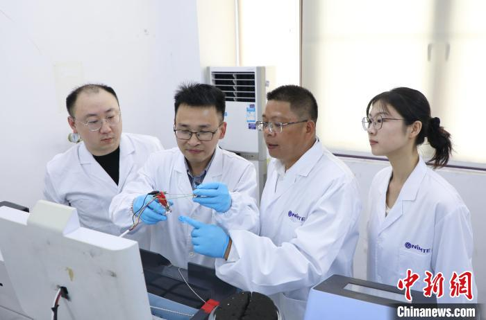 研究团队进行富锂锰基正极材料的电化学性能测试(从左到右:梁灏严博士,邱报副研究员,刘兆平研究员,顾可欣博士研究生)。中国科学院宁波材料所 供图