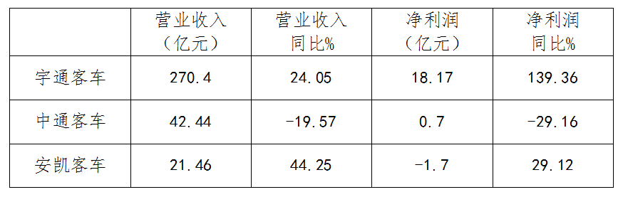 中通客车股份有限公司净利润同比增长258.12%,是三家企业中涨幅最高。