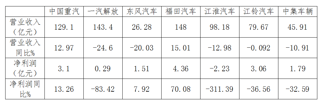 2025年一季度7家商用车上市公司经营业绩情况统计