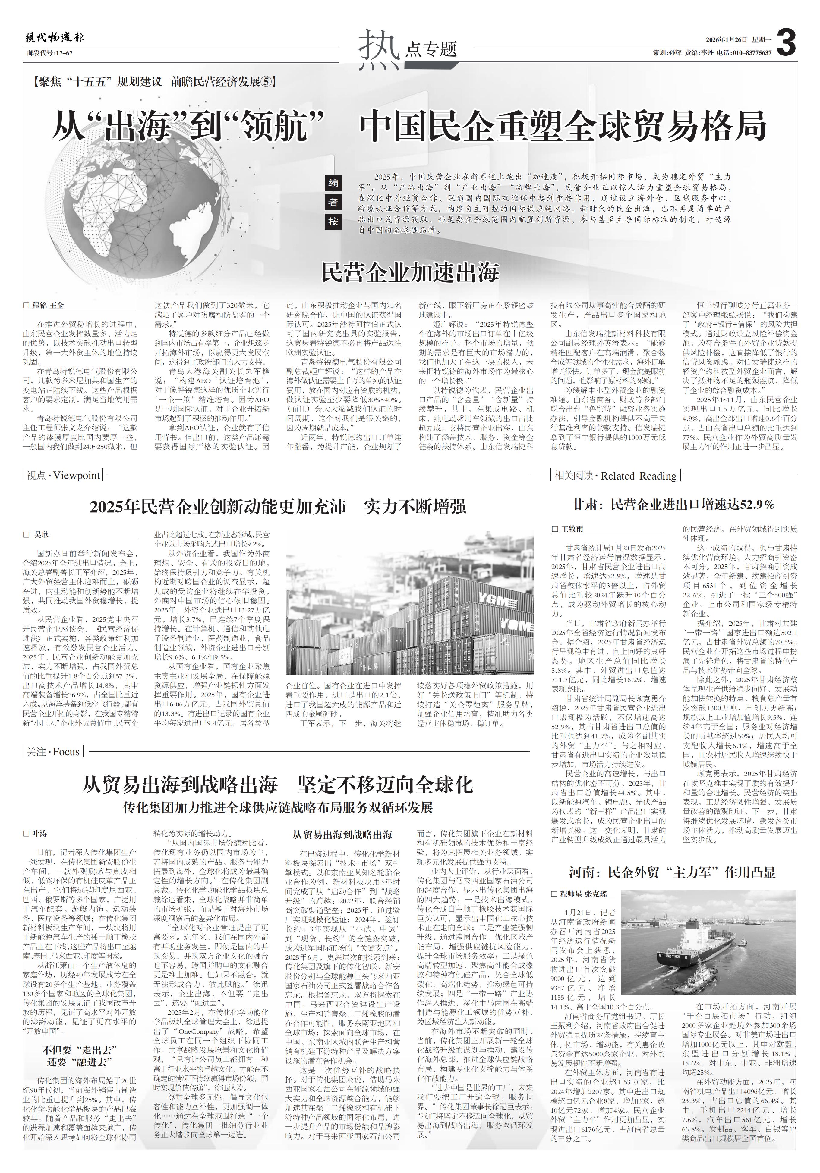 2025年,中国民营企业在新赛道上跑出“加速度”,积极开拓国际市场,成为稳定外贸“主力军”。从“产品出海”到“产业出海”“品牌出海”,民营企业正以惊人活力重塑全球贸易格局,在深化中外经贸合作、联通国内国际双循环中起到重要作用,通过设立海外仓、区域服务中心、跨境认证合作等方式,构建自主可控的国际供应链网络。新时代的民企出海,已不再是简单的产品出口或资源获取,而是要在全球范围内配置创新资源,参与甚至主导国际标准的制定,打造源自中国的全球性品牌。