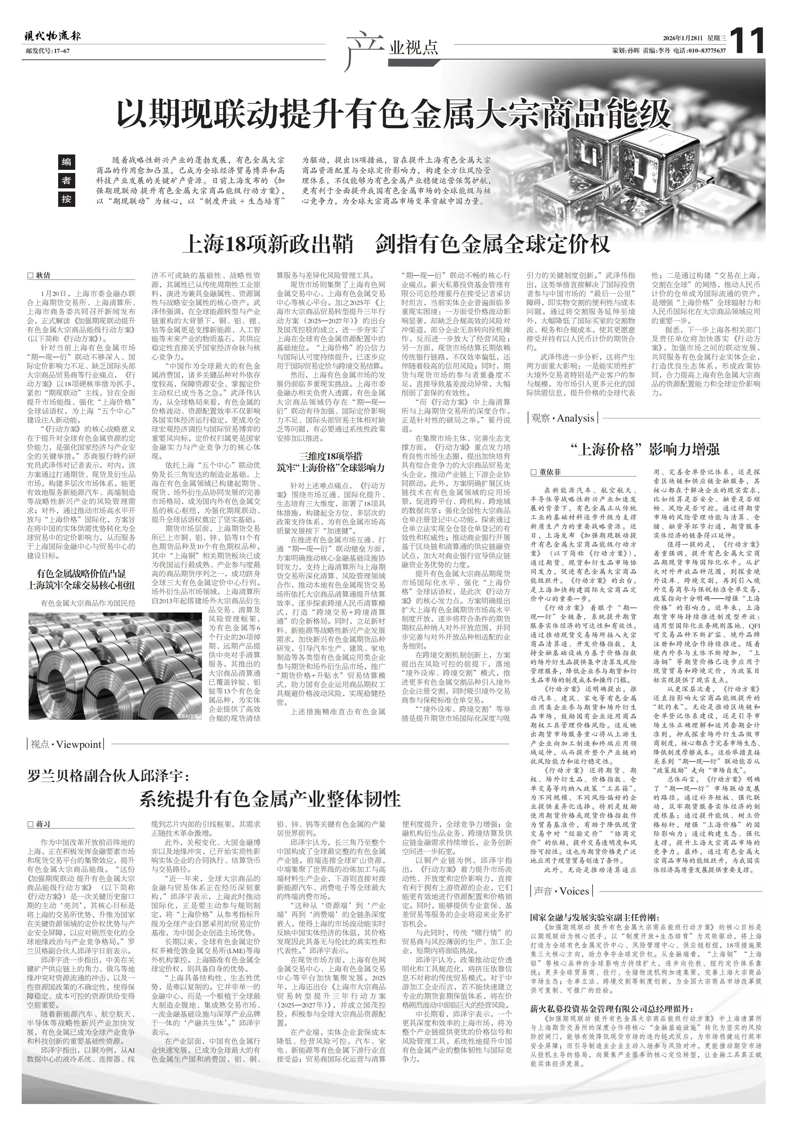 针对当前上海有色金属市场“期—现—衍”联动不够深入、国际定价影响力不足、缺乏国际头部大宗商品贸易商等行业痛点,《行动方案》以18项硬核举措为抓手,紧扣“期现联动”主线,旨在全面提升市场能级、强化“上海价格”全球话语权,为上海“五个中心”建设注入新动能。