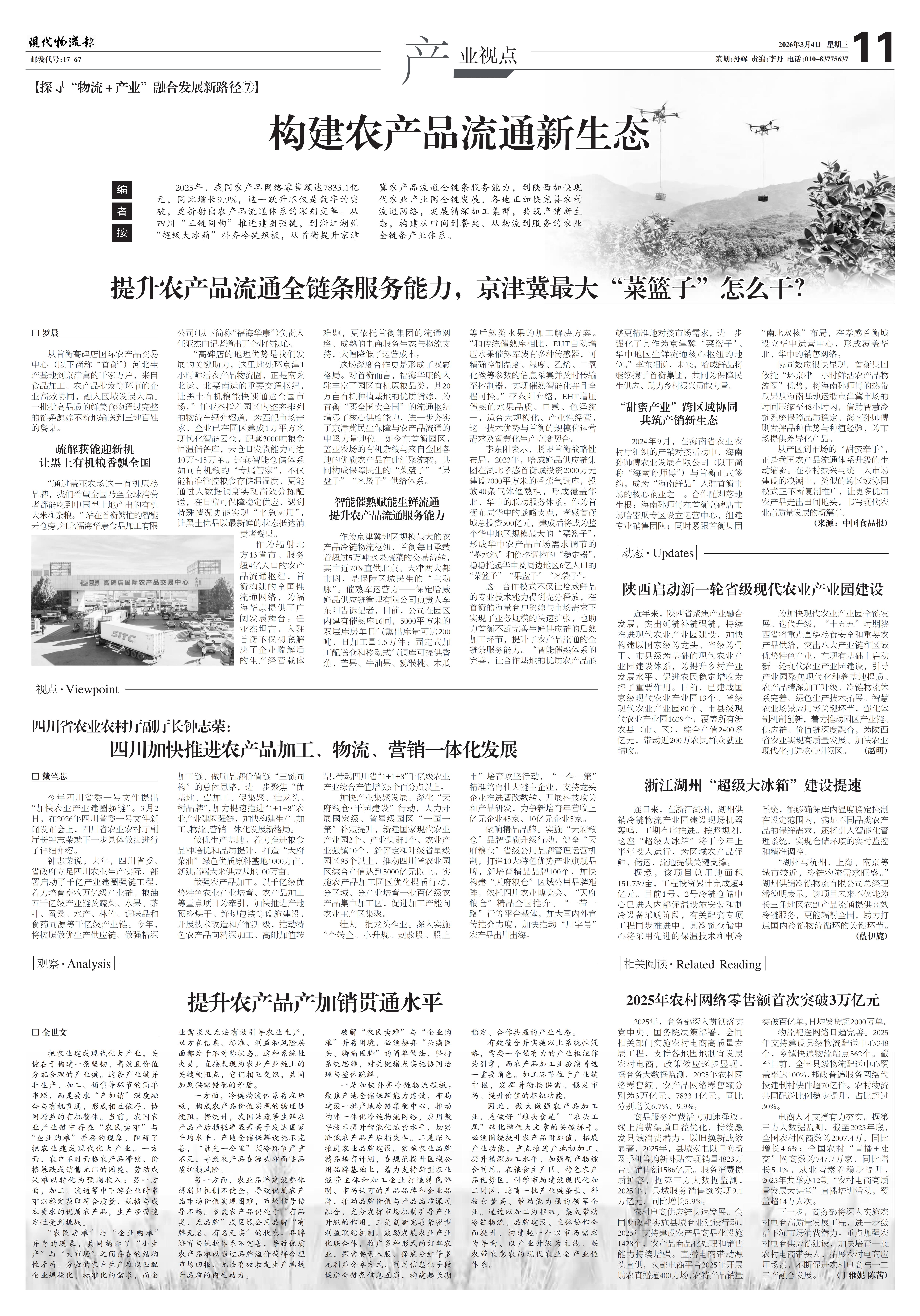 2025年,我国农产品网络零售额达7833.1亿元,同比增长9.9%,这一跃升不仅是数字的突破,更折射出农产品流通体系的深刻变革。从四川“三链同构”推进建圈强链,到浙江湖州“超级大冰箱”补齐冷链短板,从首衡提升京津冀农产品流通全链条服务能力,到陕西加快现代农业产业园全链发展,各地正加快完善农村流通网络,发展精深加工集群,共筑产销新生态,构建从田间到餐桌、从物流到服务的农业全链条产业体系。