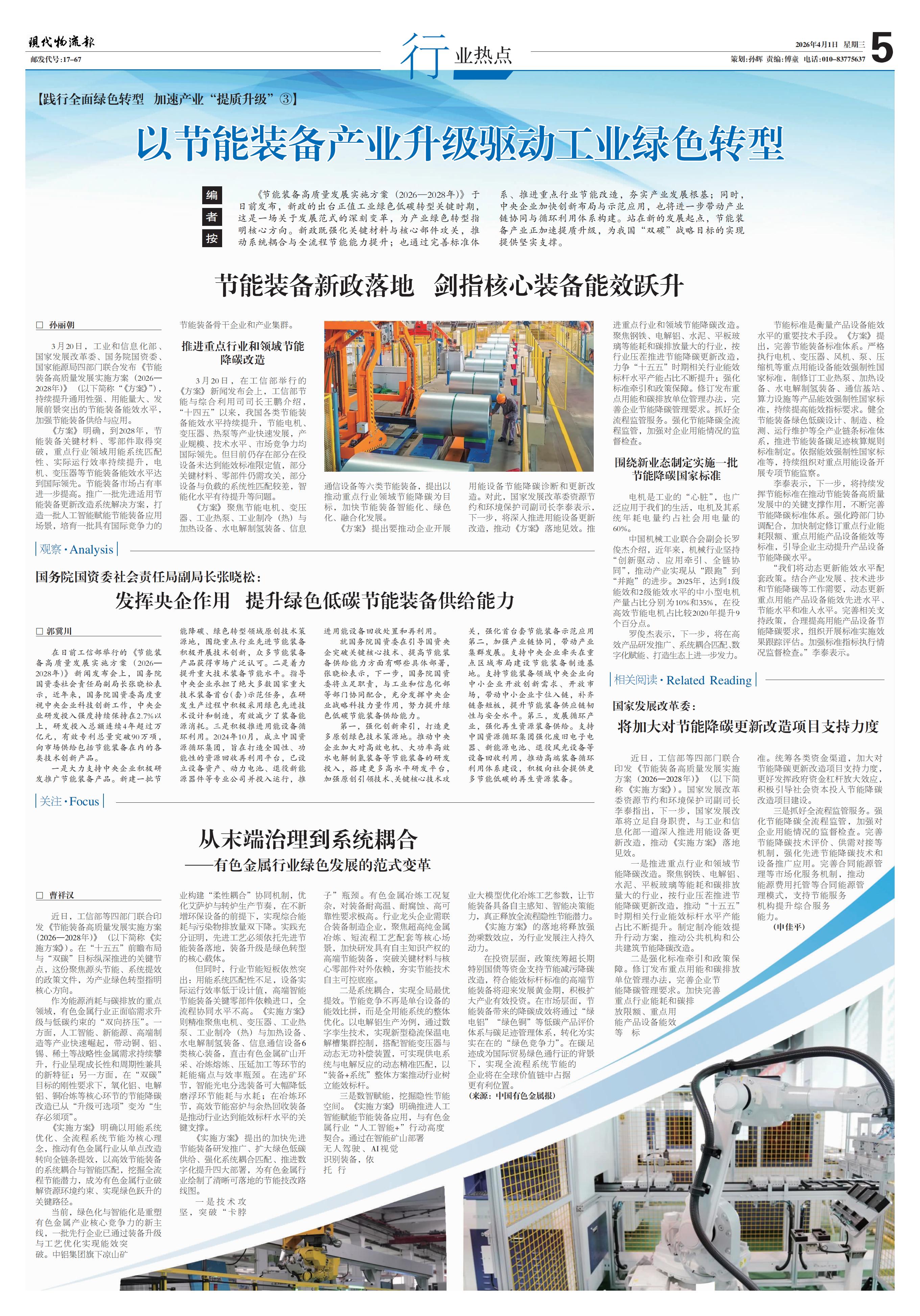 《节能装备高质量发展实施方案(2026—2028年)》于日前发布,新政的出台正值工业绿色低碳转型关键时期,这是一场关于发展范式的深刻变革,为产业绿色转型指明核心方向。新政既强化关键材料与核心部件攻关,推动系统耦合与全流程节能能力提升;也通过完善标准体系、推进重点行业节能改造,夯实产业发展根基;同时,中央企业加快创新布局与示范应用,也将进一步带动产业链协同与循环利用体系构建。站在新的发展起点,节能装备产业正加速提质升级,为我国“双碳”战略目标的实现提供坚实支撑。