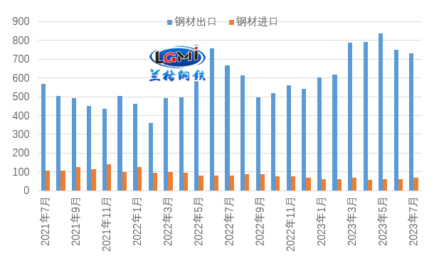 据中华人民共和国海关总署统计数据显示,出口方面,2023年7月份,我国出口钢材730.8万吨,同比增长9.5%;1-7月,我国出口钢材5089.2万吨,同比增长27.9%。进口方面,7月份,我国进口钢材67.8万吨,同比下降14.1%;1-7月,我国进口钢材441.9万吨,同比下降32.6%(详见图1)。