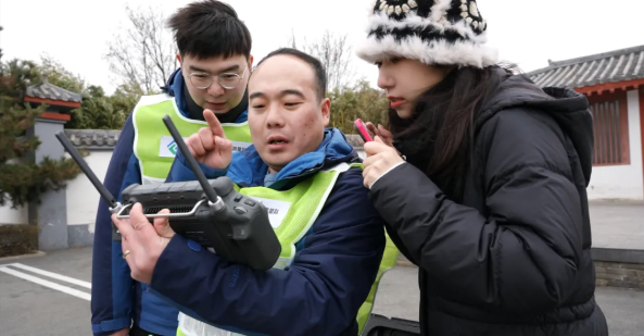 记者现场采访照:测绘队员向记者(右一)展示无人机手持端显示屏信息