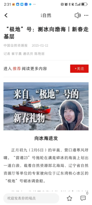走近“逆行者”,致敬奋斗者。每年春节,总有难以与家人团圆的“逆行者”,他们是穿梭在深山密林中的护林员、是坚守在偏远山区的地质队员、是驻守在江河湖泊边的水文监测员、是远在南极大陆的科考人员……他们与山川湖海为伴,是自然资源战线上的无名英雄!自然资源全媒体记者采写多篇报道,作品《来自“极地”号的新春礼物》,记者深入位于辽东湾核心冰区的“极地”号采访拍摄,记录下科考队员们春节期间在海上开展渤海冬季综合调查任务的奋斗身影;《海南陵水:北纬十八度,“陆均松”在守护》讲述了吊罗山护林员守护我国热带地区稀有热带森林生态系统的故事;《观海测冰守安澜》描绘出万家团圆时海冰调查队员顶风冒雪,奔波在我国冰情易发海岸线上的忙碌身影。