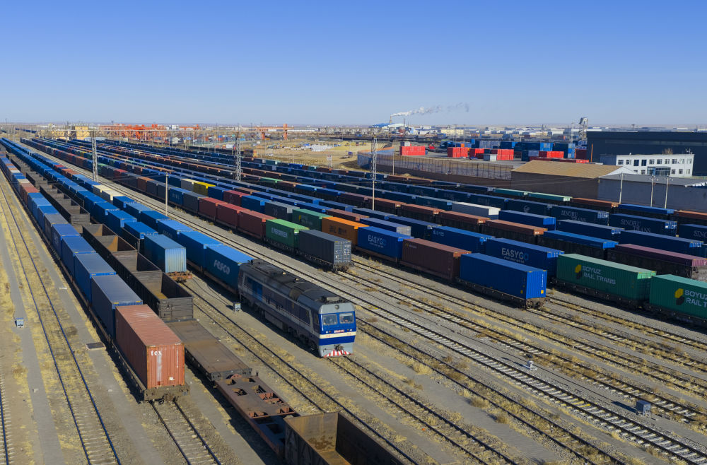 一列中欧班列停靠在二连浩特铁路口岸准轨场。(中国铁路呼和浩特局集团有限公司供图)