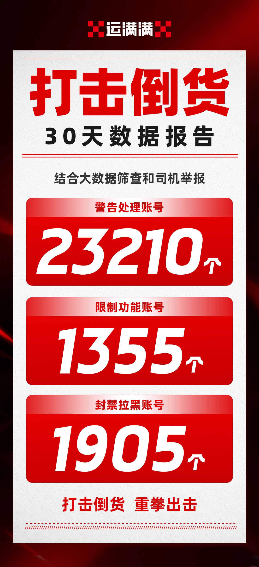 自7月15日运满满正式发布《倒货清源 携手出击 致货车司机的倡议书》以来,这场由平台牵头的"倒货清源"专项行动已持续开展一个月。数字货运平台运满满通过“大数据筛查 司机举报”双管齐下,重拳打击倒卖货源信息、压价扰乱市场等违规行为,取得阶段性成果。8月15日,平台公布首月治理成果:累计警告处理账号23210个,限制功能账号1355个,永久封禁拉黑账号1905个,并公开部分违规账号名单,获得广大货车司机的高度支持。